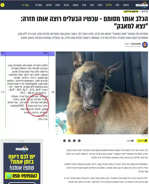 כלב מגזע רועה בלגי נמצא לפני כשבוע כשהוא מסומם במקום שבו התקיימה מסיבת טבע בצפון הארץ, מתנדבת בעמותת "חוות השאנטי" מצאה אותו והצילה את חייו. בעמותה מעוניינים לקלוט את הכלב אליהם, אך עכשיו בעליו, שנמצא באומן לרגל החג מתנגד.